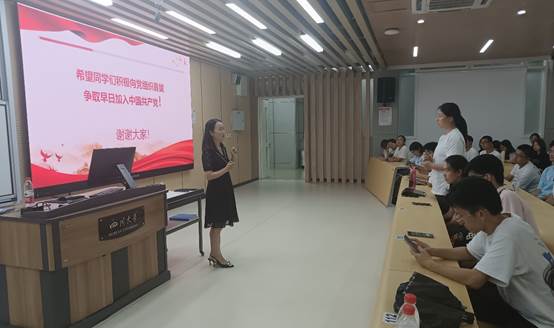 学生,为新中国成立做出杰出贡献的江姐的英雄事迹,展示了一名共产党员的崇高品格及家国情怀。最后介绍了发展党员的基本要求和程序,鼓励同学们积极向党组织靠拢,也亲切地解答了同学关于入党相关事项的问题。
