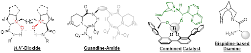 We dedicated to develop new chiral catalysts and asymmetric catalytic systems. Based on the strategies of bifunctional catalysis and C2-symmetry, we designed and synthesized a new family of N,N'-dioxide amide compounds as chiral ligands and catalysts for the first time. Novel C2-symmetric N,N'-dioxides were readily prepared by the connection of two N-oxide amide subunits via a linker with variable conformation. The structural modify to fit the targeted enantioselective reactions could be easily established by using different chiral backbone, linker units, and amines with varied steric and electronic nature. In addition to acting as bifunctional organocatalysts, N,N'-dioxide amides were developed into useful neutral ligands for Lewis acidic metals, such as rare earth metals, alkaline earth metals, group IV metals, group XIII metals. Numerous chiral tetradentate ligand-metal complexes have been established as effective catalysts (see Acc. Chem. Rev. 2011, 44, 574; Acc. Chem. Res. 2017, 50, 2621; Chin. J. Chem. 2018, 36, 791; Acc. Chem. Res. 2022, 55, 415 for details). Additionally, we also developed a useful combined catalyst, and new bifunctional organocatalysts, such as guanidine-amide, bispidine-based diamine.