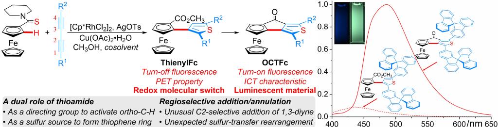 2)Lipeng Yan, Jingbo Lan,* Hu Cheng, Yihang Li, Mangang Zhang, Di Wu, Jingsong You. * Regioselective addition/annulation of ferrocenyl thioamides with 1,3-diynes via a sulfur-transfer rearrangement to construct extended pconjugated ferrocenes with luminescent properties. Chem. Sci. 2020, 11, 11030�11036.