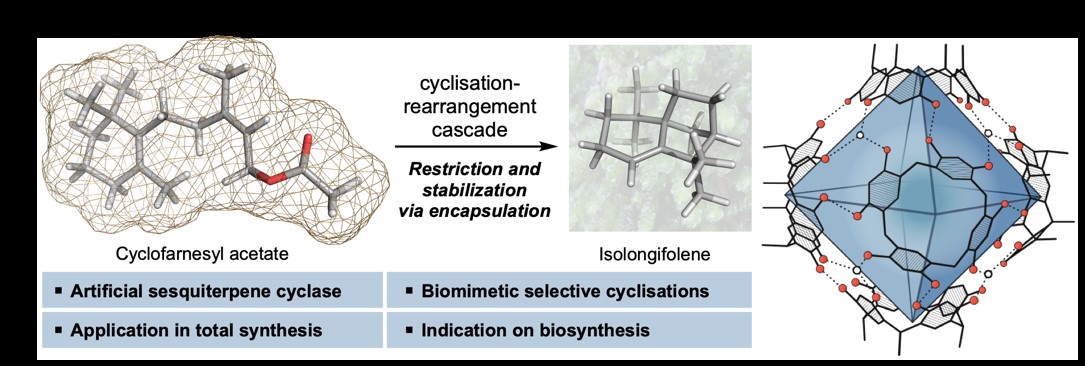 9) Zhang, Q.; Rinkel, J.; Goldfuß, B.; Dickschat, J. S.; Tiefenbacher, K.* “Sesquiterpene Cyclizations Catalysed inside the Supramolecular Resorcinarene Capsule and Application in the Short Synthesis of Isolongifolene and Isolongifolenone", Nat. Catal. 2018, 1, 609.