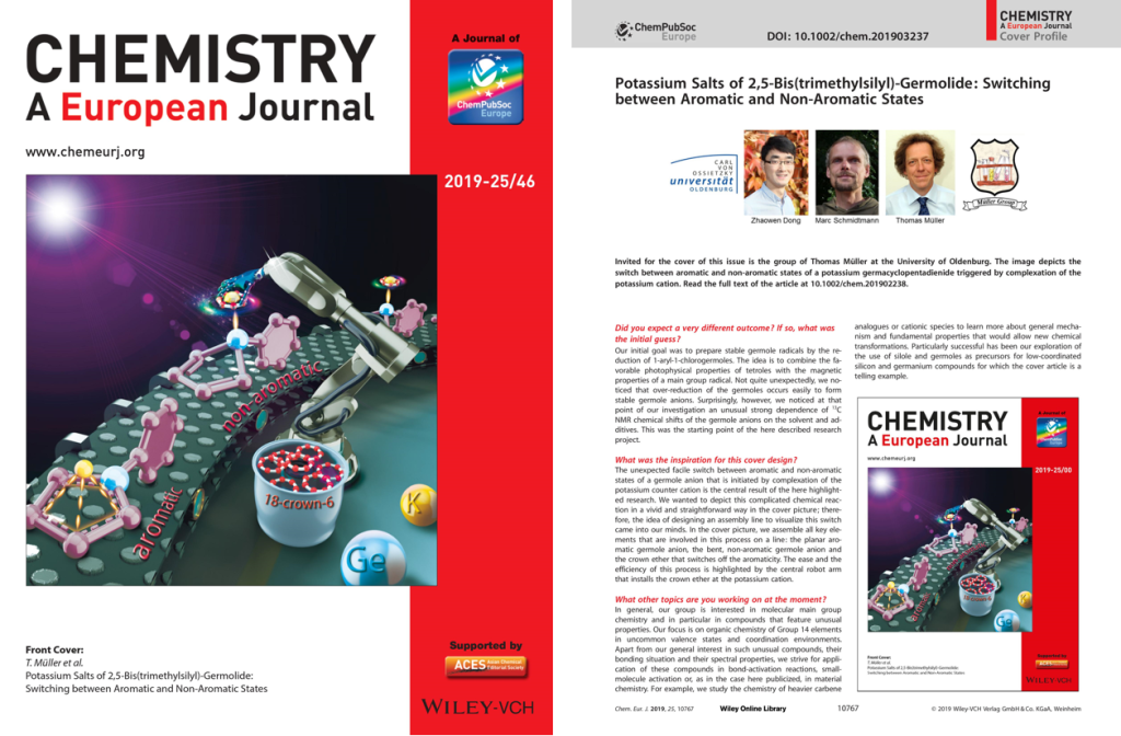 14. Zhaowen Dong, Marc Schmidtmann, Thomas Müller*, Potassium Salts of 2,5â€Bis(trimethylsily l)â€Germolide: Switching between Aromatic and Nonâ€Aromatic States, Chem. Eur. J. 2019, 25, 10858âˆ�10865. (selected as hot paper and featured on the front cover)