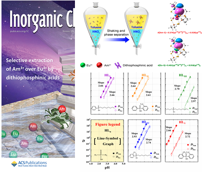 丁颂东教授课题组与清华大学核能与新能源技术研究院陈靖教授课题组合作,在《Inorganic Chemistry》上发表了题为“Highly selective separation of actinides from lanthanides by dithiophosphinic acids: an in-depth investigation on extraction, complexation, and DFTcalculations”的封面文章。该文首次系统研究了二硫代次膦酸的结构与萃取选择性和萃取能力的关系,并通过DFT计算对此种关系进行了理论阐释。