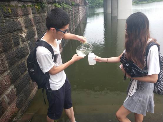 2016级10位交流营成员正式开展户外采集水样活动。一行人首先在江安校区江安河采集水样,之后三位指导老师和20位交流营成员乘车分别到达黄龙溪和府南河采集水样。当天下午,采集到的水样由老师带到望江校区实验室保存,以备后面的实验使用。