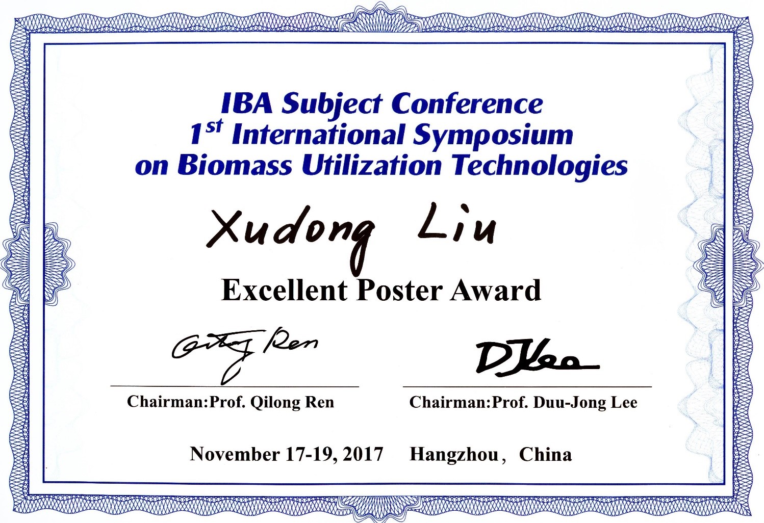 2017级硕士研究生刘旭东(导师:胡常伟教授)以 “Investigation on the dissolution and depolymerization of lignin in H2O-butanol co-solvent” 为题的墙报展示获得大会“优秀墙报展示奖”(Excellent Poster Award)。
