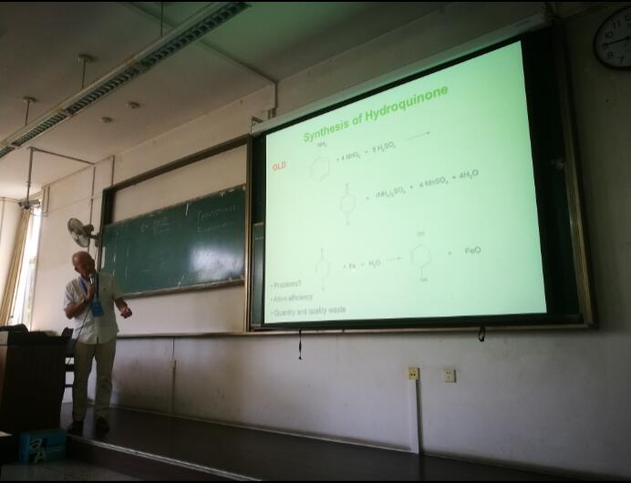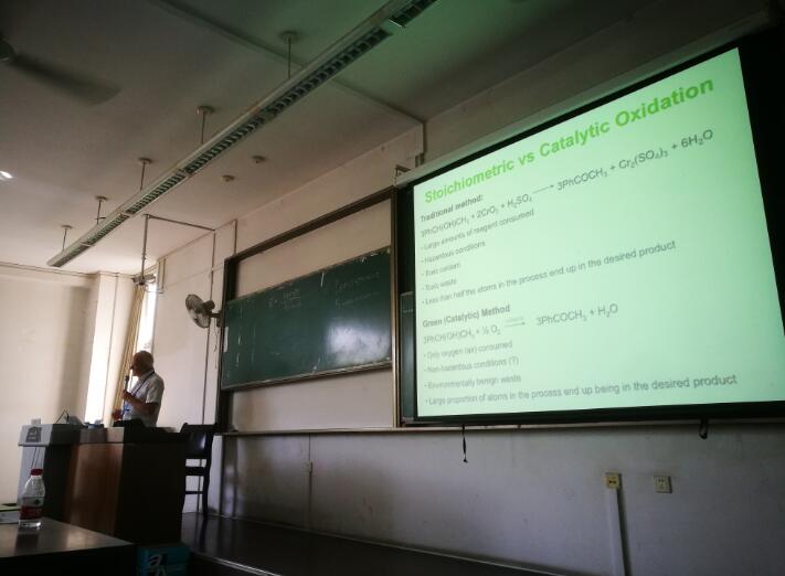 江安校区基础教学楼B座B207做了精彩的授课。第一节课首先是对英国约克镇以及约克大学的介绍:Clark教授首先对绿色化学中心进行了详细介绍:这是一个历史悠久的实验机构,算是绿色化学这门新兴学科发源地了。作为国际知名杂志Green Chemistry(绿色化学)的创刊人之一,Clark教授也算是绿色化学学科的带头人,在该研究方向有着很大的影响力;他对绿色化学的各个分支都有着独到的认识,尤其是近年来十分热门的生物质转化领域。如何有效的利用原生生物质制备生物油是发展可持续能源的必然方向,而Clark教授还特别关注于真实的工业化应用,这是生物油替代化石能源的关键一步。