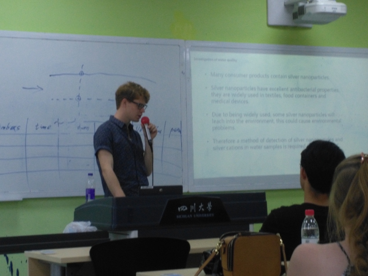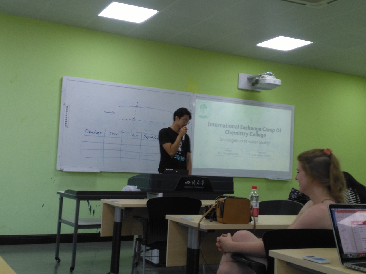 本次水质调查活动的开展情况。随后,五个小组从污染物的危害、现状,检测方法,预防和治理等方面分别对“水中的银”,“水中的有机碳”,“水中的汞等重金属”,“水中的铬”,“水中的COD与阴阳离子”进行了详细的讲解和阐述。接着,各小组进行风采展示和欢送茶话交流会。大家纷纷上台表演节目并且发言表达自己参加本次活动的感受和感想。约克大学的学生们也都分享了此次活动的收获并且表达了临别不舍之意。最后,大家分组围坐在一起自由交流感情、惜别。