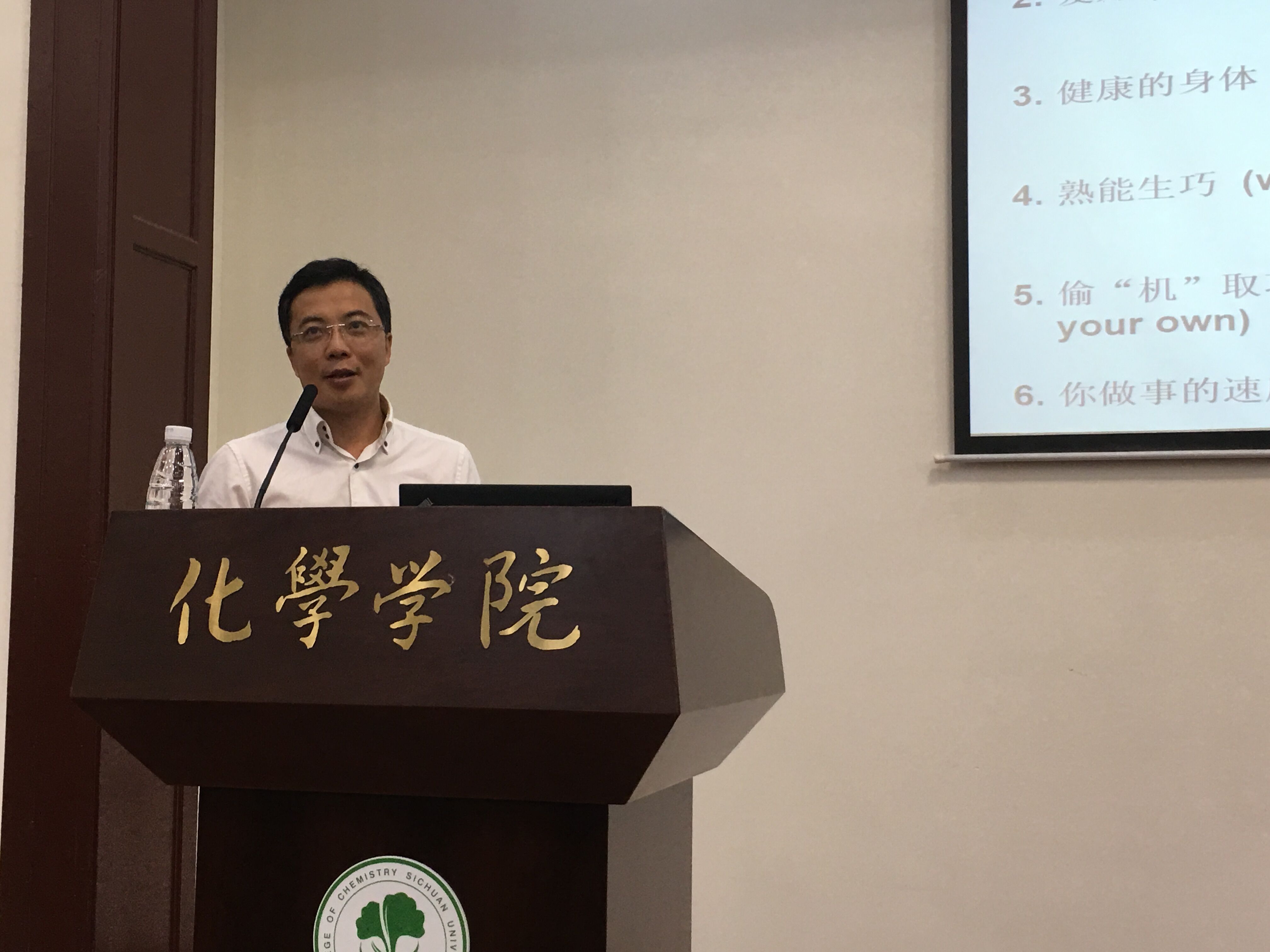 余孝其院长主持,彭强教授、徐定国教授、林之恩教授等数位老师和相关专业研究生参加。报告会前,余孝其院长介绍了张其春老师的简历和学术成就。在报告中,张其春老师首先向在座的研究生给予了从事科研的一些建议,如诚实、爱好、熟能生巧、投“机”取巧等,然后介绍了一些纳米材料和晶态材料的合成新方法和新策略,特别是表面活性剂热法应用于晶态硫族化物和金属有机框架材料的合成。张其春老师的报告内容丰富,精彩纷呈,激起了在座老师和同学的浓厚兴趣。