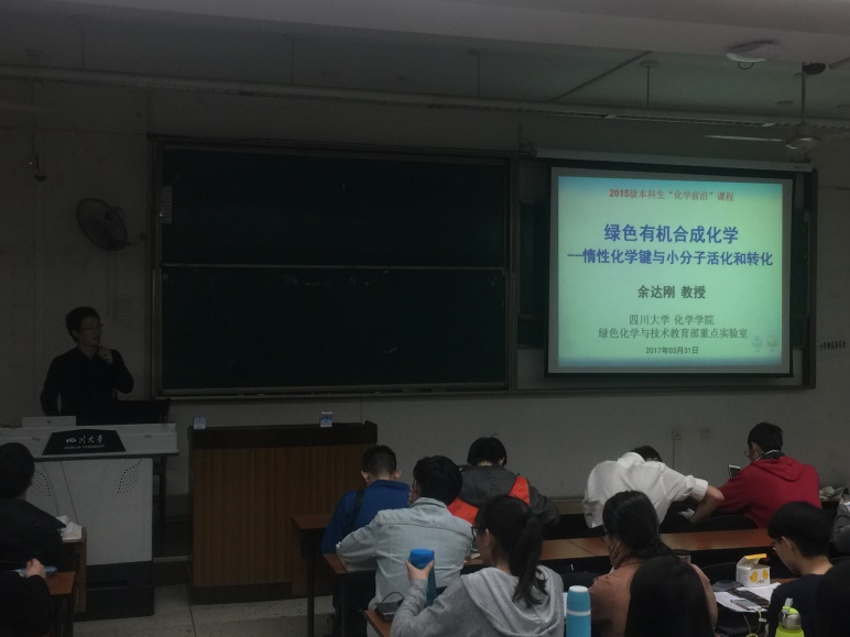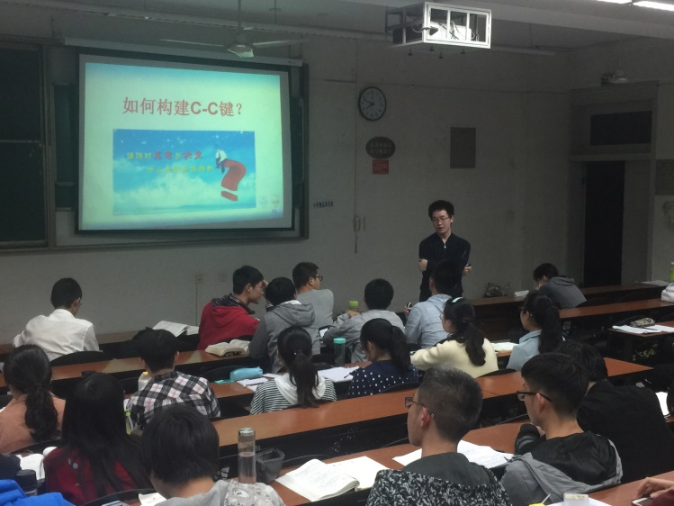 余达刚教授在整场讲座中一直与同学们进行互动,展现一位年轻教授的独特之处。通过这场讲座,我们了解到未来有机合成会走向绿色合成,会重视能源与资源利用,会注重经济化学。我们在这样的讲座学术氛围里感受到未来化学不可估量的前景。余达刚教授也告诉我们,合成化学还有很多未解决的问题。最后,在同学们热烈的掌声中结束了这场生动有趣的讲座。