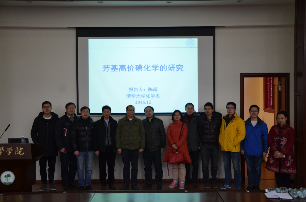 邀请,2016年12月27日上午,清华大学陈超副教授在化学馆321报告厅做了题为“芳基高价碘试剂的研究”的学术报告。报告中,陈超老师详细介绍了课题组近年来利用高价碘试剂诱导环化反应,由此发展了多组分一锅法合成杂环化合物的策略。陈老师报告内容丰富,讲解深入透彻,激起了在座老师和同学的浓厚兴趣,报告在热烈的掌声中落下帷幕。报告结束后,与部分师生进行了进一步的交流和讨论。