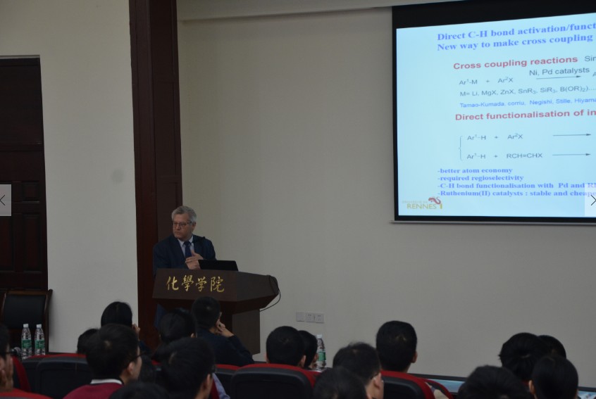 邀请,2016年10月26日上午,法国雷恩大学Pierre H. Dixneuf教授在化学馆321报告厅做了题为“Ruthenium(II) catalysed C–H bond functionalisations”的学术报告。报告中,Dixneuf教授详细介绍了所领导的课题组近年来在钌(II)催化的C–H功能化反应领域的整体研究情况。Dixneuf教授报告内容丰富,讲解深入透彻,幽默风趣,激起了在座老师和同学的浓厚兴趣,报告在热烈的掌声中落下帷幕。报告结束后,Dixneuf教授与部分师生进行了进一步的交流和讨论。