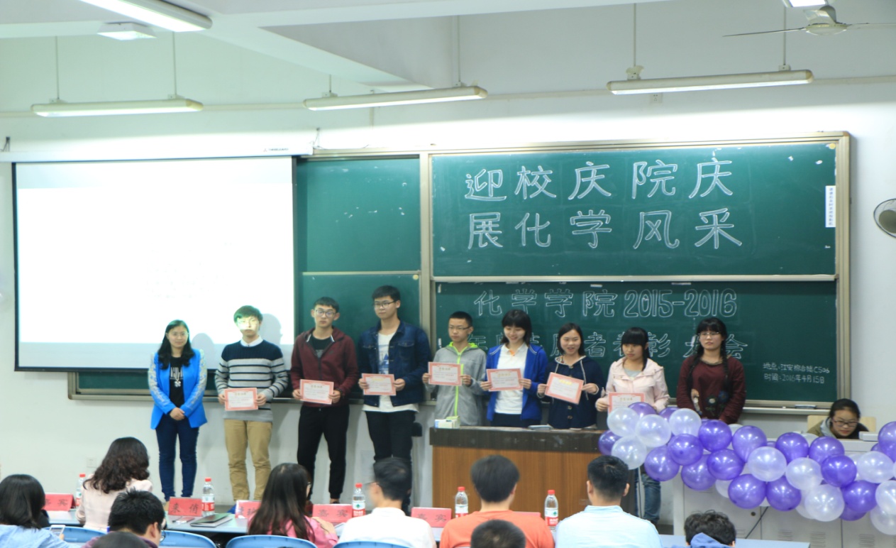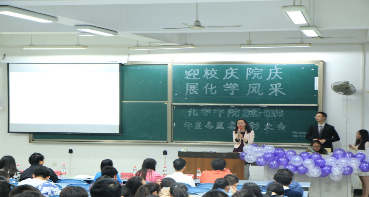 团委青年志愿者服务队主办的“迎校庆院庆,展化学风采”志愿者表彰大会在江安校区综合楼C座506教室正式举行。出席本次活动的嘉宾有团委书记来俏老师,2015级辅导员李珍焱老师,学生会主席周柏辛,副主席王振宇、焦健,团委副书记黄雅琳以及阳光青年志愿者服务队队长江淼洁,以及2015级所有的同学。