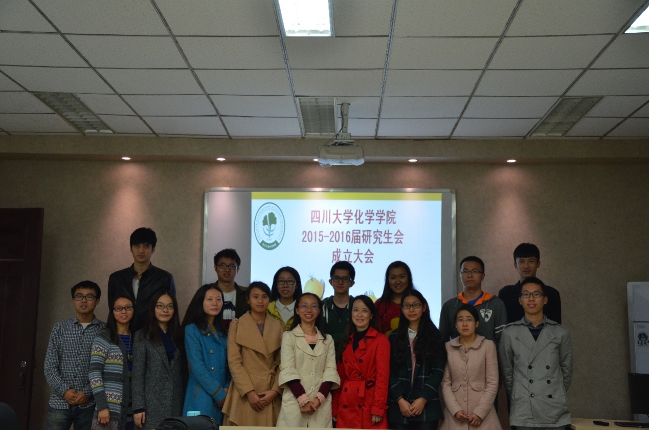 2015-2016届研究生会成立大会在化学馆122召开,学院党委副书记谢均老师、学院分团委书记来俏老师、前任化院研分会主席焦燕同学与本届日本色情片