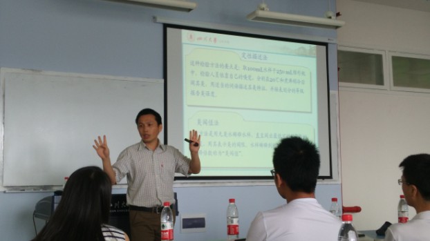 在简单讲解了水污染的主要类型后,郑成斌教授以本次水质调查活动的开展为重点,讲解了前期准备工作、水样的采集与保存、水样的预处理等。进行实际采样之前一定要制定好明确的采集计划,明确分工,对对查阅资料了解当地的气候对于河流中的污染物含量的影响,并且根据监测断面来合理设置采样点。对于采得的水样,一定要记录好时间、地点以及采集的人物等。针对采样过程,郑成斌教授又详细介绍了急流采样器等几种采样器的工作原理。最后,大致介绍了对采得的水样进行物理性质的检验、汞等金属化合物的测定、有机污染物的测定等等。