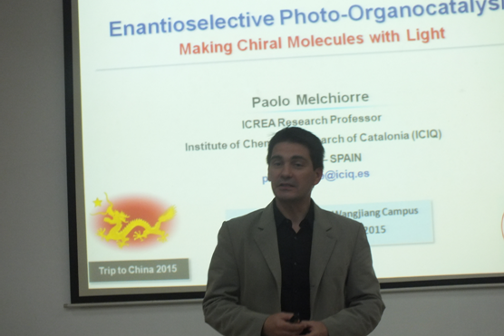进行学术交流,并于当天上午十点在化学馆321报告厅作了题为“ Enantioselective Photo- Organocatalysis- Making Chiral Molecules with Light”的学术报告。Melchiorre教授介绍了他领导的课题组在相关领域的研究进展:1)利用催化量的手性胺与羰基化合物原位生成亚胺,该亚胺与卤代物通过形成EDA complex中间体,继而生成高光学纯度的产物;2)此外,烯醇负离子也能与卤代底物形成EDA complex中间体,继而生成高光学纯度的产物;3)光促电子转移是形成EDA complex的关键,其中亚胺和烯醇负离子作电子供体。Melchiorre教授发展的EDA complex反应体系,相对于Photo-Redox反应体系而言,不需外加金属催化剂,因此更加绿色高效。Melchiorre教授的报告内容新颖,讲解深入透彻,引起了在座广大师生的兴趣,宾主双方就多个主题做了热烈讨论。