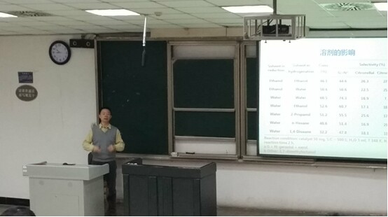首先,李教授为同学们讲解了Ru-Co-Sn催化剂的制备及己二酸二甲酯加氢的反应。通过均相催化的技术,均相催化是催化剂与反应物同处于一均匀物相中的的活性中心比较均一,选择性较高,副反应较少,大大提高了反应的效率。同学们面对如此高效的反应方式表示对均相催化产生了浓厚的兴趣。