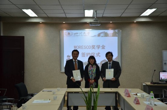 ”MORESCO”奖学金捐赠协议书。接着,廖海燕老师向大村洋一先生和刘英进先生颁发荣誉证书。最后,所有嘉宾、老师和学生代表合影留念。