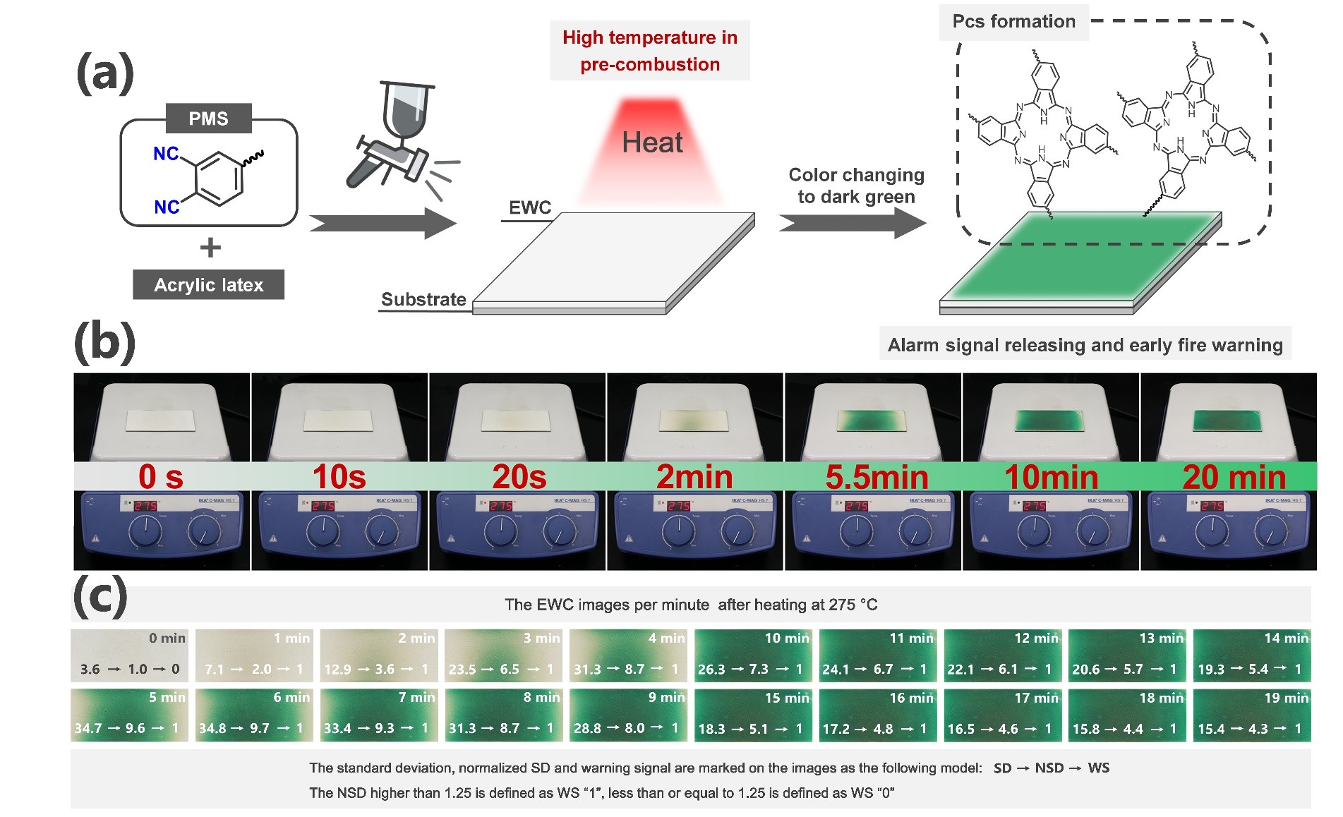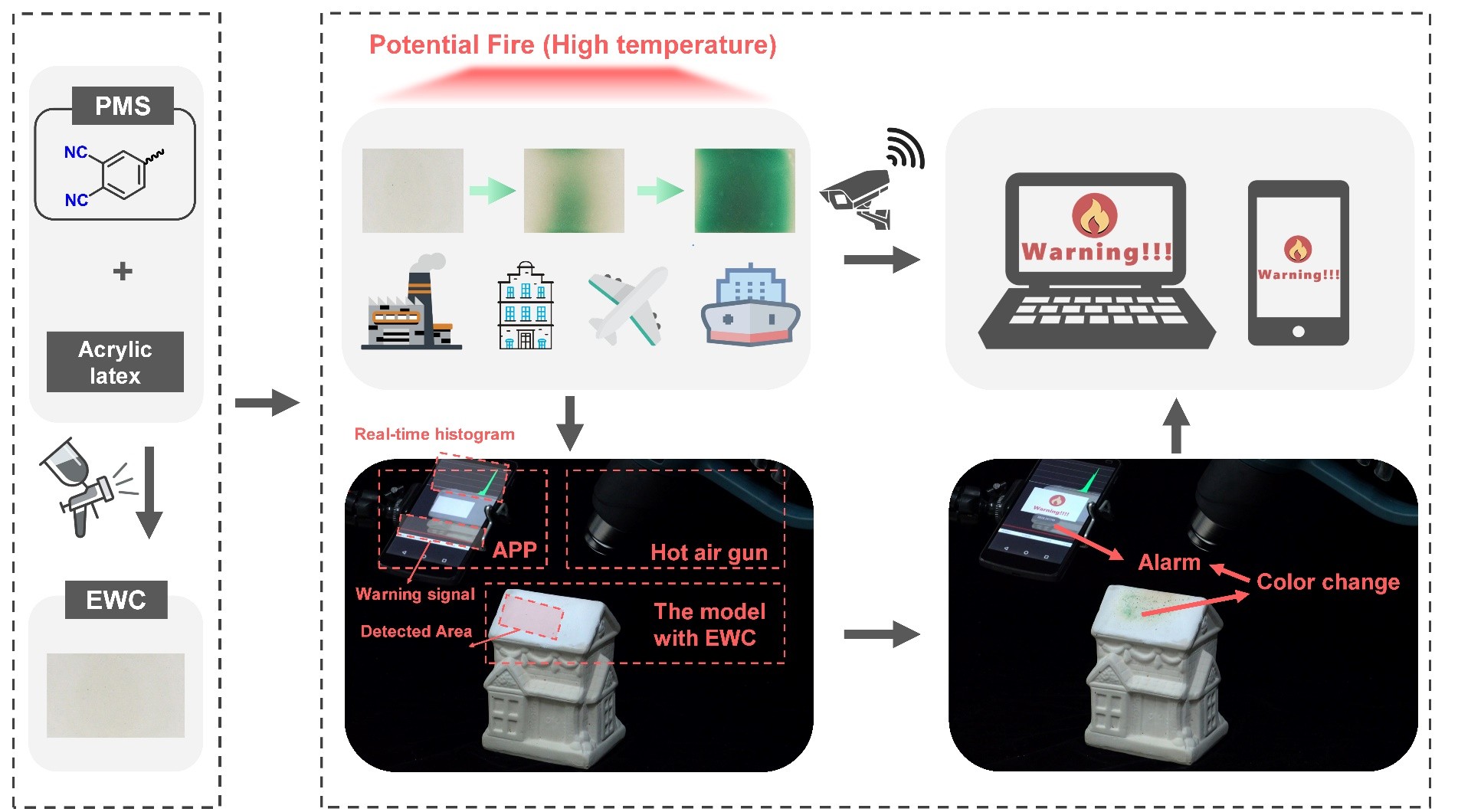 王玉忠教授团队受到自然界中的植物叶绿素的代谢和分子结构启发,设计制备出可在潜在火灾的高温下发生智能变色的分子传感器(Precursor Molecular Sensor,PMS),并将其与图像识别算法相结合,发展了一种防火于未燃的极早期潜在火灾和早期火灾的探测预警技术,可实现20s内潜在火灾高温响应(275°C)和3s内明火预警(预警技术示意图如图1所示)。