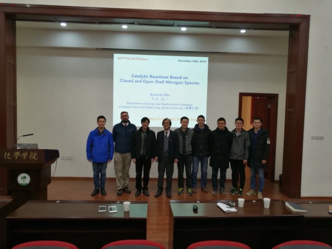 ,并在化学馆321报告厅做了题为“Catalytic Reactions Based on Closed and Open Shell Nitrogen Species”的学术报告。Kouichi Ohe教授首先介绍了氮宾化学及其在不对称合成2H-Azirine中的应用,随后介绍了他们团队对铁催化的分子内酮亚胺的氨基氯化反应和环加成反应的相关研究进展。报告内容丰富,引起师生们广泛兴趣。报告后,在场师生与Kouichi Ohe教授进行了热烈而深入的交流和讨论。