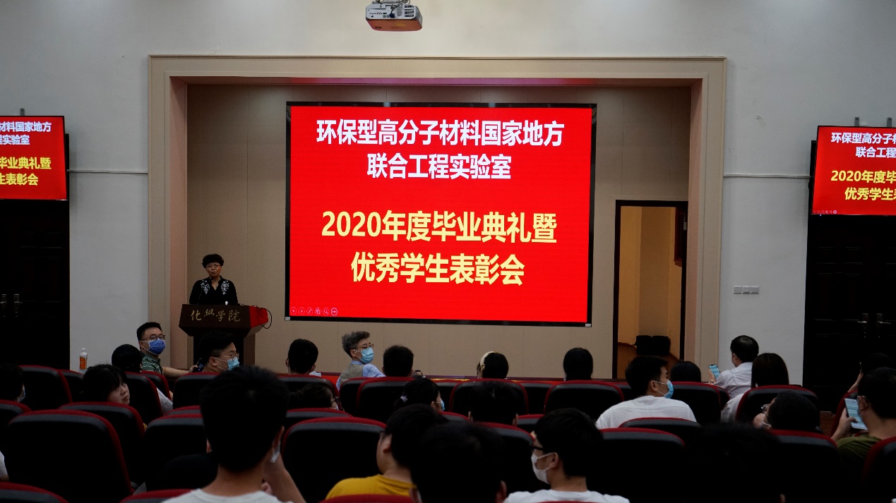 环保型高分子材料国家地方联合工程实验室(简称环保实验室)2020届毕业典礼暨优秀学生表彰大会在化学馆321报告厅隆重举行。会议由实验室党支部书记汪秀丽教授主持。为遵守防疫相关规定,我室全体师生相互保持距离就坐,并佩戴口罩参加了此次大会。