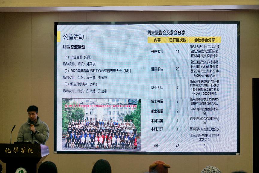 随后,王玉忠院士总结和分析了本年度实验室的投入与产出情况。赵泽永老师对2020年度实验室测试及仪器设备使用情况进行了说明,并再次提醒大家测试过程中的注意事项。郑冠棋同学作为学生工作负责人,总结了2020年环保实验室党支部、学术型社团、各个学生部组织和开展活动的情况,对各位同学为实验室所作出的贡献表示感谢,并汇报了学生组织的换届情况,希望同学们积极热情地参与学生组织工作。