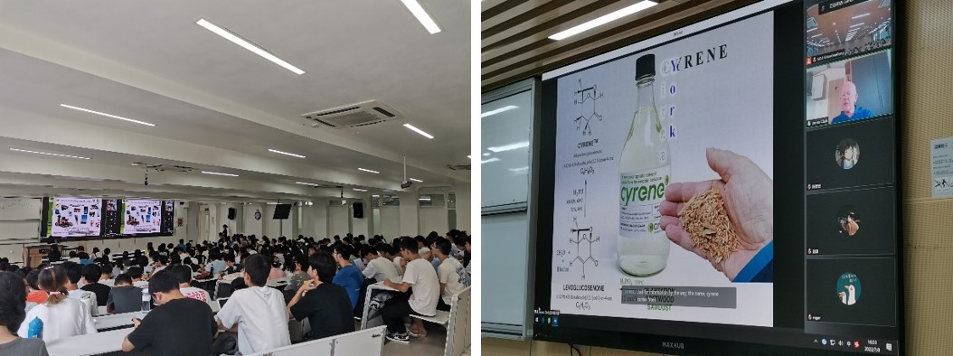 的同学。本次课程采用线上与线下结合的方式,同学们集中在教室,通过视频会议与James H. Clark教授实时互动。Clark教授为同学们带来《绿色化学原理》、《绿色化学产品》、《废物和立法》等专题讲座。