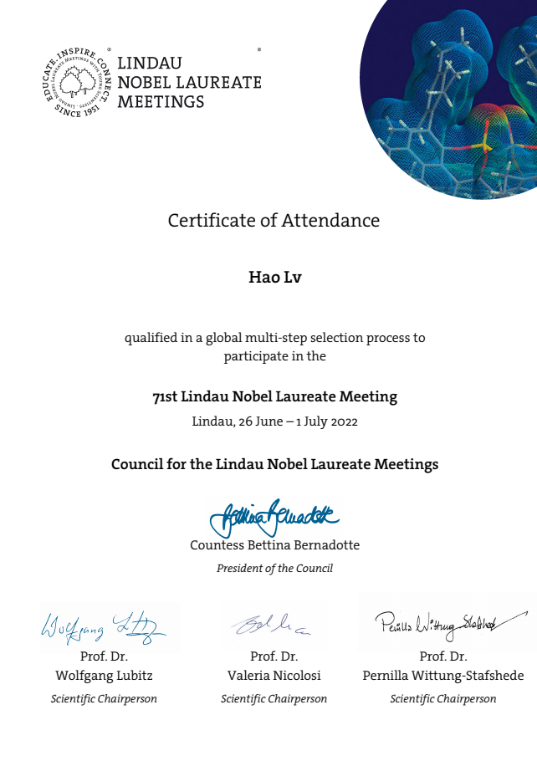 第71届诺贝尔奖获得者大会于2022年6月在德国林岛举办,本届会议主题是化学,尤其聚焦在催化与合成和有机催化方面。日本色情片2020级博士研究生吕浩通过层层选拔,从全国众多知名高校的158名优秀博士生和青年学者候选人中脱颖而出,作为国内最终获得参会资格的30名博士生之一,与30位诺奖得主和来自90个不同国家地区近500位优秀的青年学者们共赴学术盛宴,探讨化学领域科研最新进展。