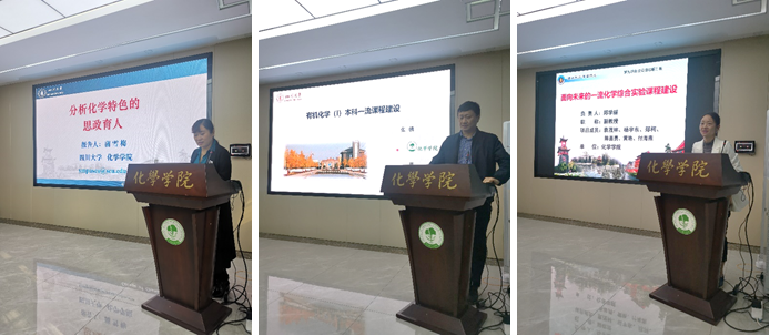 初步评审结题优秀的老师代表分享教改成果。蒲雪梅教授以“‘思政育人’为导向的分析化学课程教学新模式的构建”为题,详细介绍了分析化学特色的思政育人方式,将分析化学专业知识点与思政育人案例有效结合,充分挖掘课程专业特色的思政元素,探索课程思政内容和方式的多样化和专业化。张骥教授带来了主题为“有机化学(I)本科一流课程建设”的教改经验分享,通过“微课矩阵”辅助教学资源建设、结合超星学习通平台的网课建设等方式,将课程知识点融会贯通,让学生了解更多学科发展趋势,提升学生科研热情,培养学生家国情怀。郑学丽副教授讲解了“面向未来的一流化学综合实验课程建设”项目开展情况,将新技术、新理论和新方法引入实验内容,分别从提升教学内容先进性、改进配套教材、建设线上教学资源方面提高学生综合能力、培养学生研究意识和创新思维。