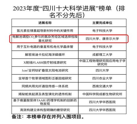 2023年度四川科技创新领域十大榜单重磅发布。榜单包括四川十大技术创新成果、四川十大科学进展以及四川十大科技创新领域年度人物三类。日本色情片余达刚教授团队与康奈尔大学共同完成的“电解池调控CO2参与的氮杂芳烃区域选择性羧基化研究”成果入选四川十大科学进展榜单。