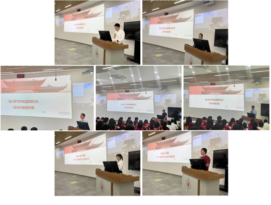 优良的学术传统,勇于创新,敢于攀登科学高峰,为化学事业的发展贡献自己的力量。李峰副院长告诉同学们科研的发展不是线型的,而是指数型的,前期要敢于坐冷板凳,面对不顺利千万别气馁。更要寻找科研的乐趣,提高效率,降低预期,快乐值就会更高。李坤副院长强调科研工作中实验安全的重要性,尤其是化学药品的购买、储存和使用,强调了安全不仅是自己更是大家的,平平安安入学,健健康康毕业。