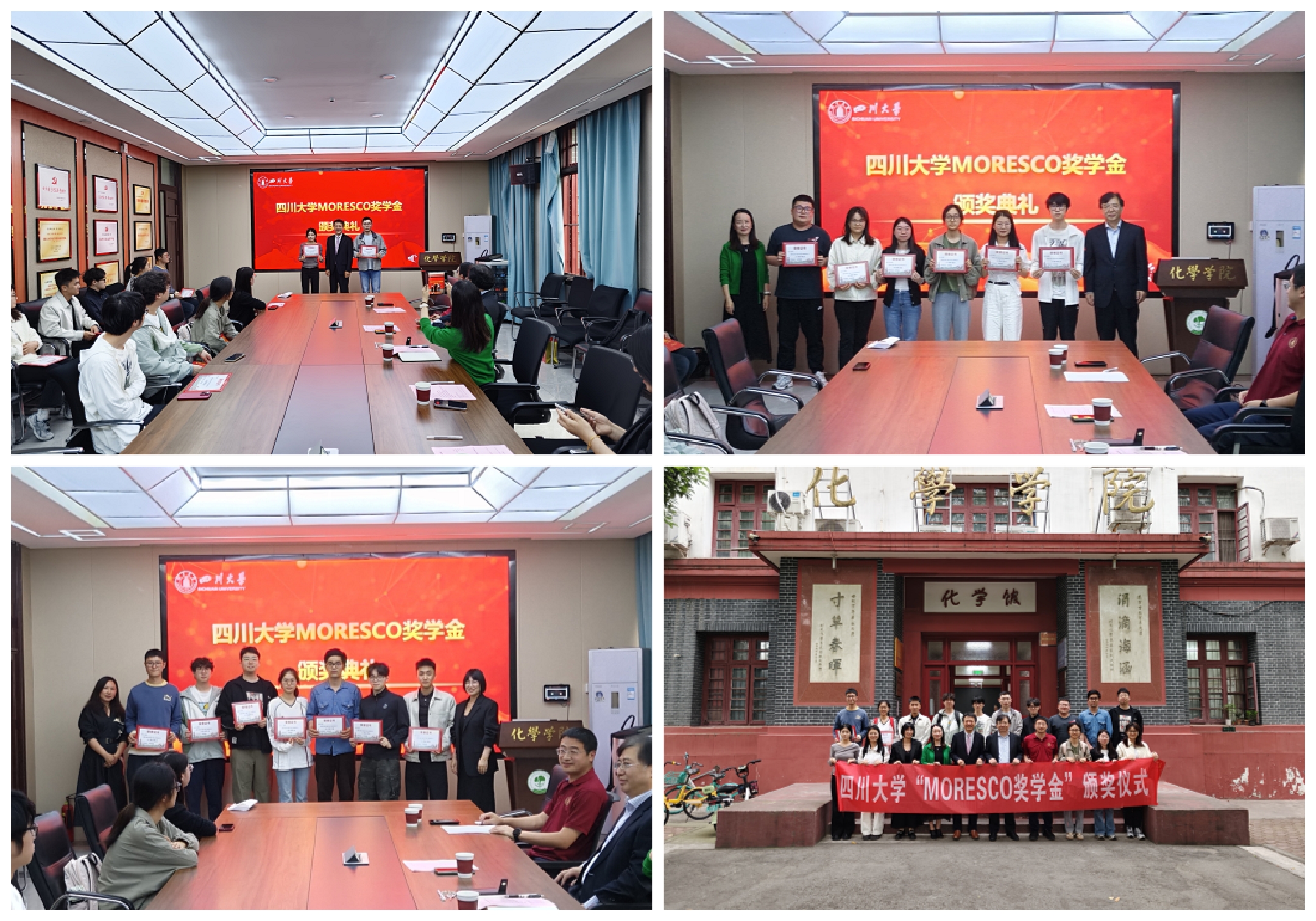 MORESCO奖学金颁奖典礼在化学馆122会议室顺利举行。株式会社MATSUKEN原社长大村洋一先生,株式会社MORESCO执行役员、莫莱斯柯贸易(浙江)有限公司、莫莱斯柯(浙江)功能材料有限公司董事长刘英进校友,莫莱斯柯中国研发中心经理杨帆校友,日本色情片