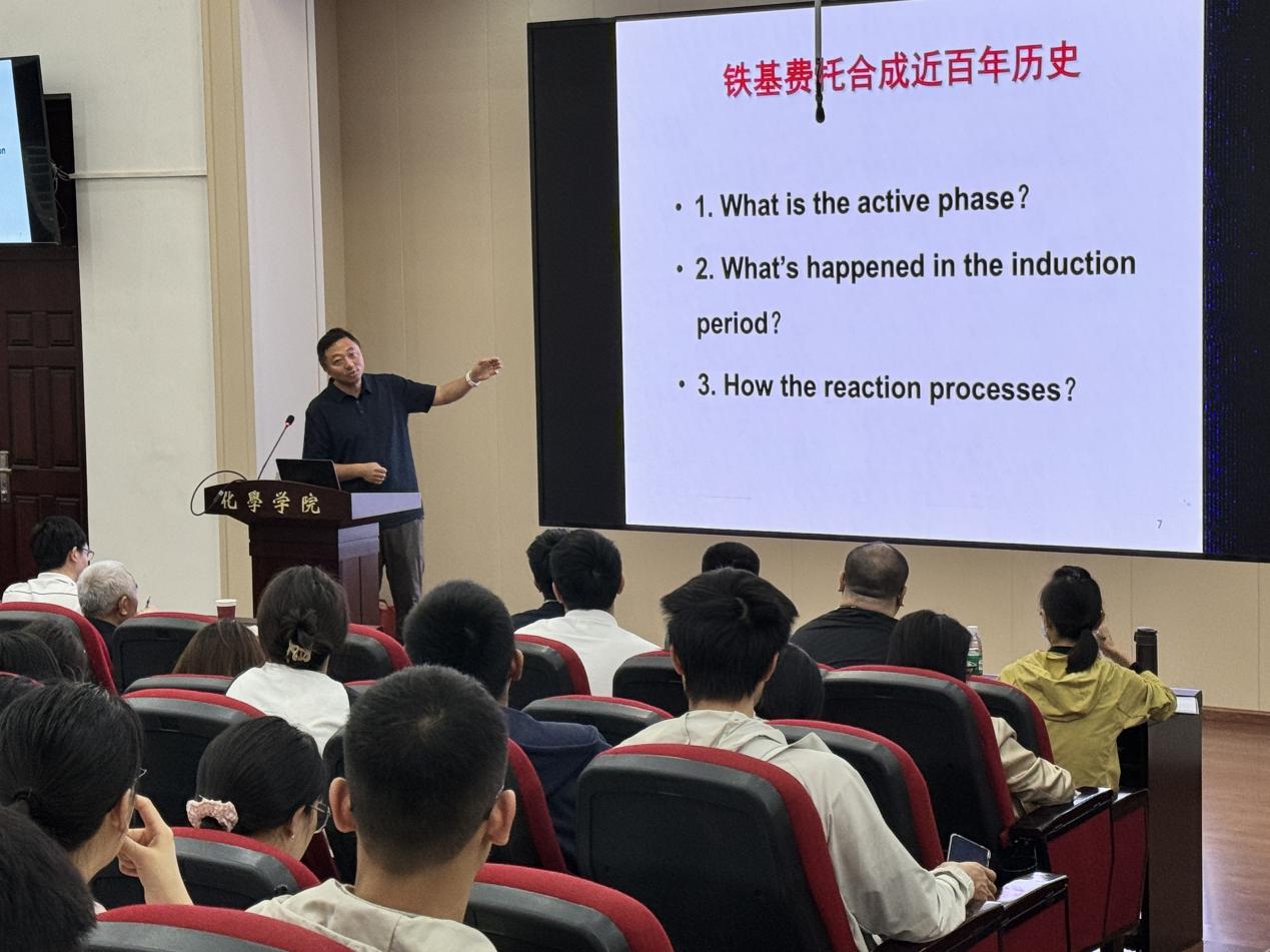 报告环节,马丁院士以深厚的学术积淀为基础,围绕铁基费托合成催化剂选择性调控这一主题展开分享。他结合团队的系统性原创研究,详细阐述了通过锌、钠助剂协同调控铁催化剂,实现合成气定向转化的关键突破:锌物种作为结构助剂调控铁活性相尺寸,钠助剂则通过修饰表面电子结构提升一氧化碳活化能力,二者协同作用不仅抑制了烯烃的过度加氢,更实现了产物选择性的精准调控。报告中,他还介绍了如何通过偶然发现,通过向铁基费托合成反应气体中添加百万分之一浓度的卤素化合物,成功将二氧化碳副产物从传统工艺的30%左右降至1%以下,实现“近零碳排放”,同时将高附加值烯烃产率提升至85%以上,为绿色合成气转化和低碳化工制造提供了新策略。报告兼具理论深度与应用前景,深入浅出的讲解让在场师生对催化科学服务国家能源战略的价值有了更深刻的认识。