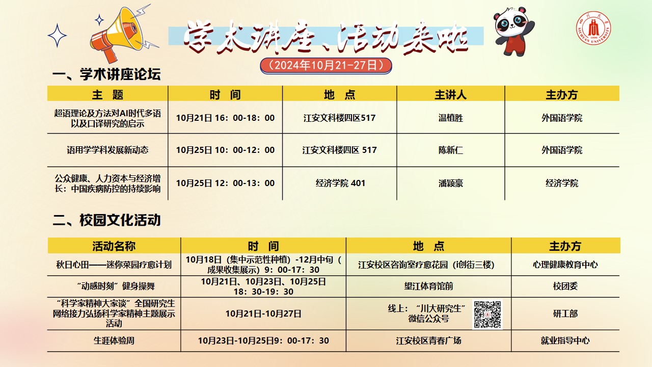 学术讲座论坛及校园文化活动预告(2024年10月21日-27日)
