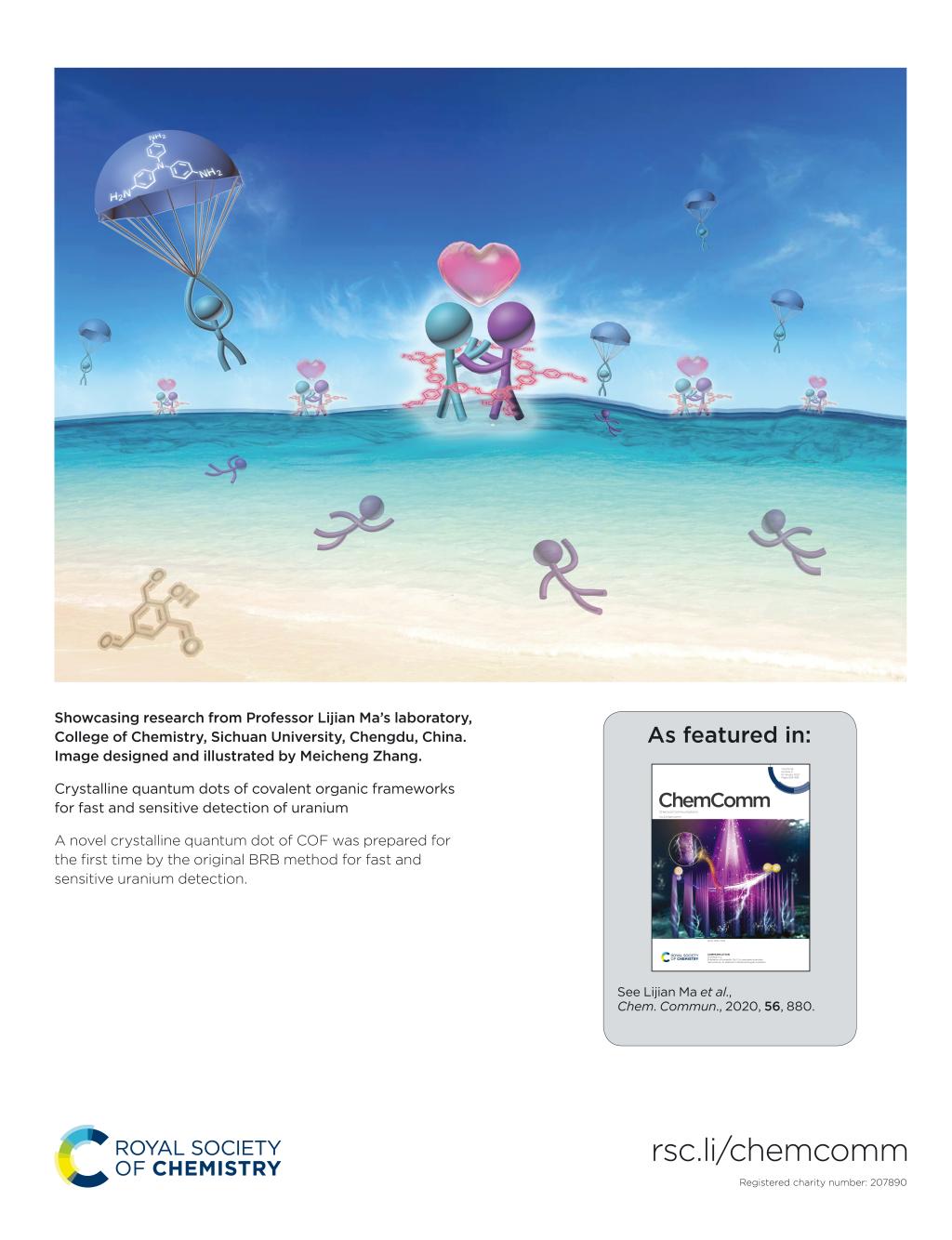 7. Meicheng Zhang, Yang Li, Lijian Ma*, Xinghua Guo, Xiaofeng Li, Kun Li, Xiaoyan Wang, Chuanqin Xia, Shoujian Li. Crystalline quantum dot of covalent organic framework for fast and sensitive detection of uranium. Chem. Comm., 2020, 56, 880–883. (DOI: 10.1039/c9cc08278f) (Cover)