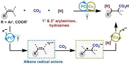 5. J.-P. Yue, J.-C. Xu, H.-T. Luo, X.-W. Chen, H.-X. Song, Y. Deng, L, Yuan, J.-H. Ye*, D.-G. Yu*, Metallaphotoredox-enabled aminocarboxylation of alkenes with CO2. Nat. Catal. 2023, 10.1038/s41929-023-01029-9.