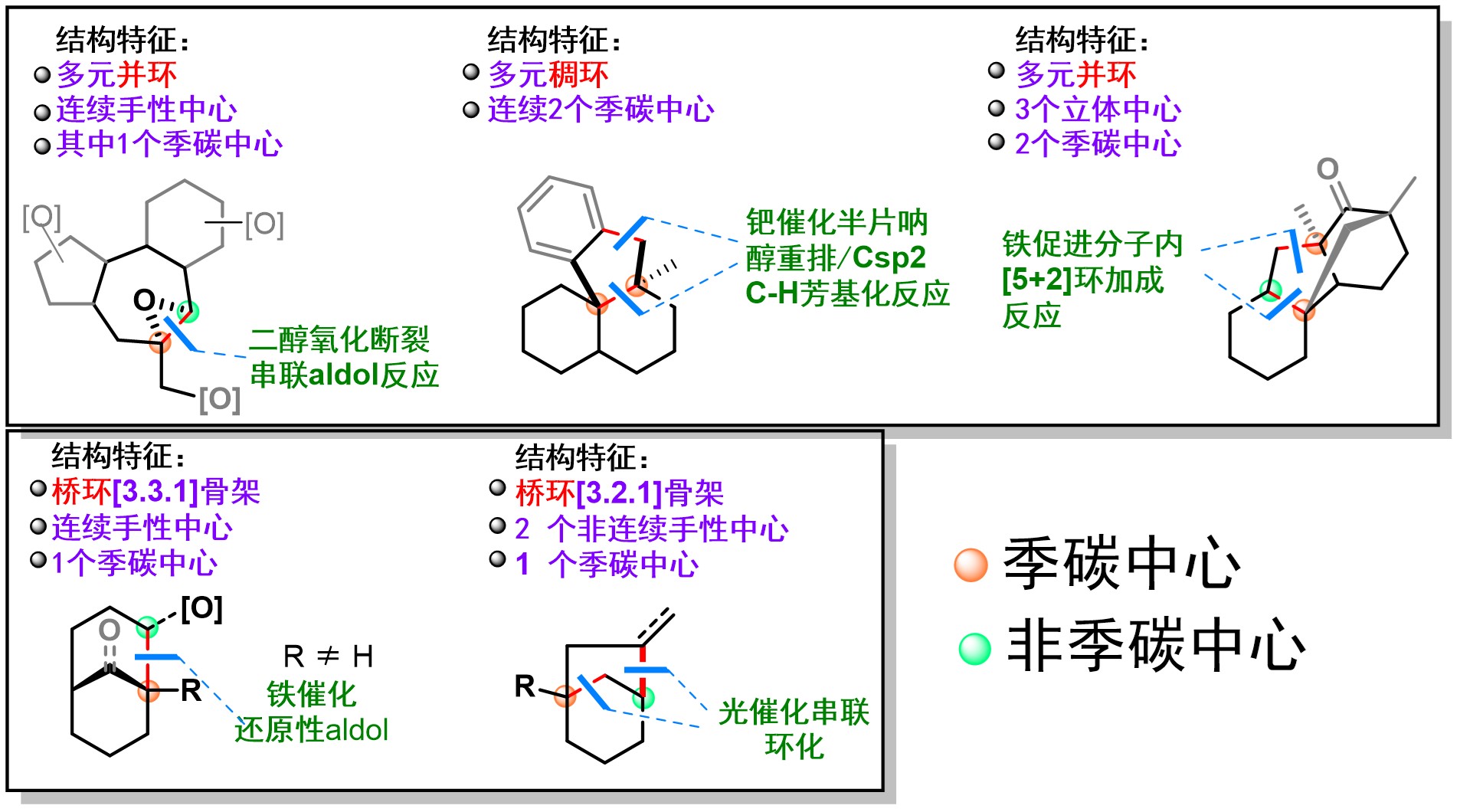 研究兴趣主要多环骨架结构为研究对象,针对性开发高效合成策略,拓展其在复杂分子合成中的应用(1)。针对含季碳中心的不同桥环骨架,创新性地发展了光催化烯醇硅醚的串联反应以及铁催化还原aldol反应。针对含季碳中心的不同并环骨架,发展了钯催化半片呐醇重排串联Csp2-H芳基化反应,二醇氧化断裂串联aldol反应以及铁促进[5+2]环加成反应。并以此实现了C20氧化对映贝壳杉烷二萜sculponin U和丁香烷倍半萜rumphellclovane E的全合成以及数个天然产物核心骨架的构建。建立了光催化烯醇硅醚的串联反应合成桥环和稠环骨架的方法学。开发了反常区域选择性的铁催化γ/δ-烯基烯酮串联环化反应合成双环环丙醇的策略。累计发表论文 53篇,它引超过 1400 ,其中以第一(共同)或者共同通讯作者发表论文35篇,包括 J. Am. Chem. Soc. 发表 2 篇,Angew. Chem. Int. Ed. 发表 2 Org. Lett. 8Chem. Comm. 1OCF 3JOC 2两篇论文入选ESI高被引论文,2篇论文引用超过200次,最高它引超过280