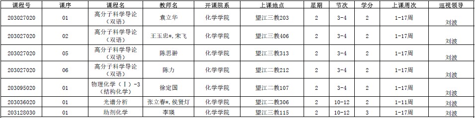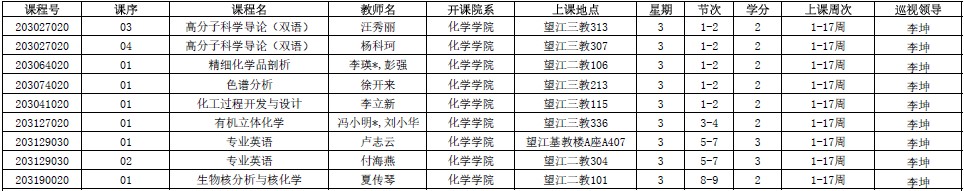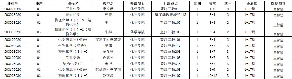 王智猛书记、谢均副书记、郑成斌副院长、刘波副院长、李坤副院长、杨成主任分别对江安、望江两个校区2019年秋季学期9月2—4日38门次课程进行了交叉巡查(后附具体安排)。巡视教师会预留时间在课前和课后与任课教师、学生交流上课情况,积极听取师生的建议,对师生反应的问题给予及时的反馈。