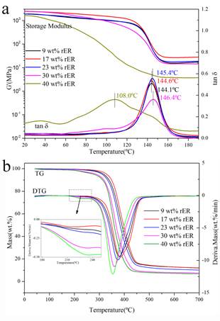 图3不同降解液(rER)含量对再固化树脂的动态热机械性能的影响,(a)储能模量G’和损耗因子;(b) TGA曲线