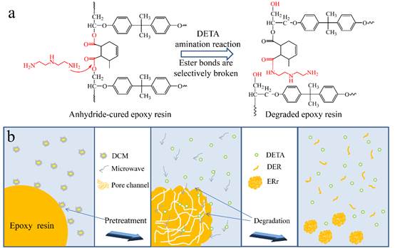 图2(a)MER的化学结构和胺解机理;(b)DETA催化降解环氧树脂示意图