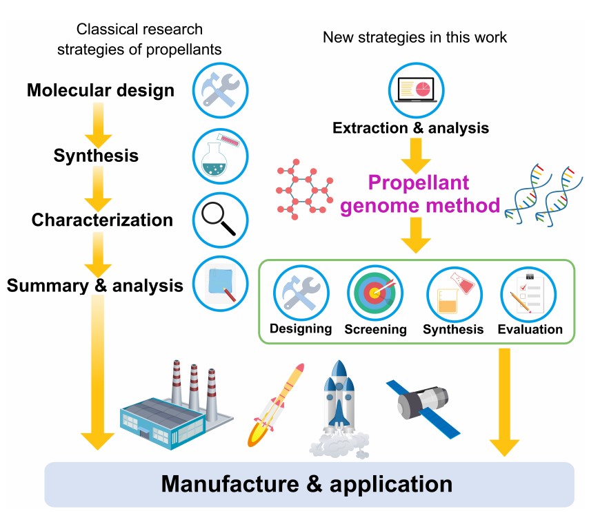 为解决上述问题,该团队创新性地采用材料基因组方法探寻自燃烧推进剂的核心因素。不同于对燃料分子单一结构修饰、实验探索的传统方法,该工作通过构建推进剂的结构数据库明确其构效关系,采用可视化手段探寻与自燃烧性质关联的重要指标,而后利用筛选程序对自燃烧添加剂结构进行高通量筛选和量化分析,从而明确了自燃烧推进剂添加剂的结构,并通过一系列实验手段验证其极大降低了推进剂点火延迟时间,体现出材料基因组策略的可行性。该成果首次从根本上解决了火箭燃料分子设计的构效需求,可对材料分子按需设计及多角度预测,为将高性能推进剂走向实用提供重要参考。