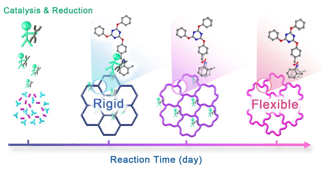 作为一类新兴的具有规则孔道的晶态多孔材料,共价有机框架材料(COFs)近年来受到研究者们广泛的关注。已报道的COFs大多采用刚性的亚胺键连接,且超过80%的亚胺键COFs在合成中使用乙酸作为催化剂。但在实际应用中,乙酸催化得到的刚性C=N键连接的COFs由于具有比较固定的结构和孔道尺寸,有时会限制材料中活性位点和功能基团优势的充分发挥。为此,已有一些柔性COFs被研究和报道,其结构相比于刚性COFs具有一定的弹性和自适应性特点,可随客体分子的进入发生动态变化,有助于其应用性能的提高。但由于构建柔性COFs的单体模块在空间上的灵活多变和可扭转性,柔性结构框架的搭建通常是比较困难的。结构框架的柔性增加也会使材料的晶形变差,甚至导致无规聚合物的生成。