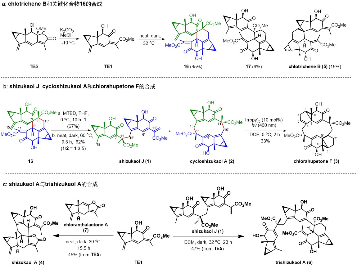 刘波教授课题组自2008年起,持续开展乌药烷倍半萜化合物的合成研究,已经实现了多个该类天然产物的全合成。最近,他们以被广泛接受但尚未证实的TE1为关键的生源中间体实现了六个乌药烷天然产物的全合成(图1),验证了生源合成途径。该合成工作首先以TE1为中间体通过自身Diels-Alder反应,高立体选择性地实现了头碰头型[4+2] 二聚体chlotrichene B 的全合成,以及获得了关键化合物16(图1a),该中间体可以通过骨架重排生成异源二聚体shizukaol J以及十二元环二聚体cycloshizukaol A。Cycloshizukaol A可在光照下发生乙烯基环丙烷的骨架重排,后续衍生为天然产物chlorahupentone F(图1b)。除此之外,三烯中间体TE1可与乌药烷倍半萜单体chloranthalactone A 以及二聚体shizukaol J 分别发生二聚化反应得到背靠背型 [4+2]二聚体shizukaol A以及三聚体trishizukaol A(图1c)。
