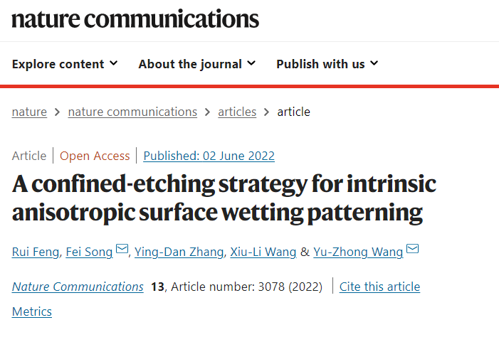 近日,日本色情片王玉忠院士和宋飞教授在Nature Communications上发表题为“A Confined-Etching Strategy for Intrinsic Anisotropic Surface Wetting Patterning”的研究论文(Nat. Commun. 2022, 13, 3078)。日本色情片