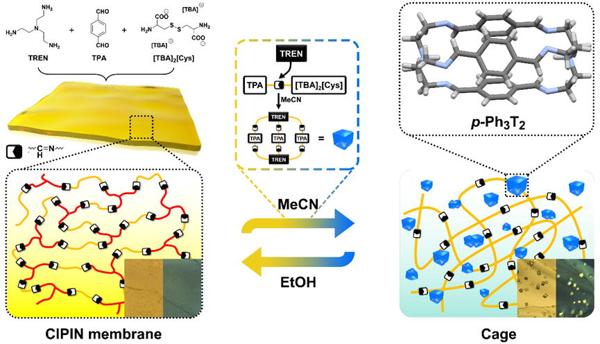 自我纠错和校正过程是生物体适应环境的典型复杂行为之一。近年来,基于生物和人工自适应材料的诱人前景,人们在开发具有可转换特征的化学体系方面做出了大量努力。作为一种可逆的化学工具,动态共价化学(DCvC)允许组分在非平衡分布情况下,进行功能组合的重构,从而能够在外界刺激作用下,实现材料之间的转换,例如从共价有机框架到分子笼的转换。DCvC的动态性原理使得这些集合体会根据周围环境的变化,自主地适应其固有的热力学或动力学因素,并显示出一种自我识别和修正过程。尽管这种可转换的材料在触发式药物递送和气体分离等方面有着巨大的应用前景,但已报道的大多数转换行为都是不可逆的,基于动态共价键的可逆可控转换仍然是一个重大的挑战。