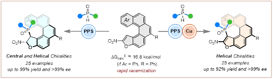 螺烯是一类非平面螺旋形分子,通常由多个芳香环或芳香杂环邻位稠合组成,该类分子因其独特的扭曲结构在材料科学、分子识别和不对称催化等领域有着十分重要的应用。然而,由于缺乏理性的底物设计、合适的反应选择以及高效的催化剂体系,手性含磷螺旋烯化合物的催化不对称合成仍面临重大挑战。