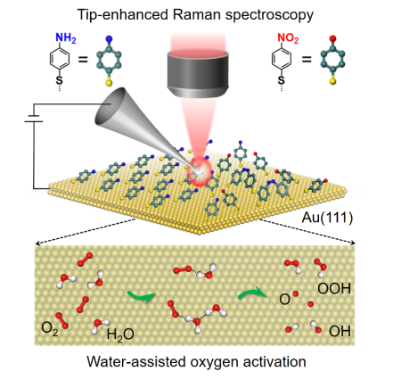的Naresh Kumar研究员合作,利用针尖增强拉曼光谱技术(Tip-enhanced Raman spectroscopy,TERS),结合模型体系设计与氧同位素标记策略,成功实现了Au(111)模型催化剂界面上分子氧活化过程的纳米级高空间分辨拉曼光谱研究。研究表明,在大气条件下,分子氧可以在Au(111)表面上发生活化,并将表面上吸附的4-氨基苯硫酚分子(4-ATP)氧化为4-硝基苯硫酚分子(4-NTP)。进一步,结合氧同位素标记策略,将O18标记的H2O18分子引入到反应环境中,发现在氧化形成的4-NTP产物中能检测到O18的存在,验证了分子氧在Au(111)面上的活化过程是一个界面水辅助氧化的机制。该研究在纳米尺度上对Au(111)表面分子氧的活化过程进行了精准表征,提出了界面水辅助分子氧活化机制,对于丰富氧气在金催化剂上的活化理论具有重要意义。