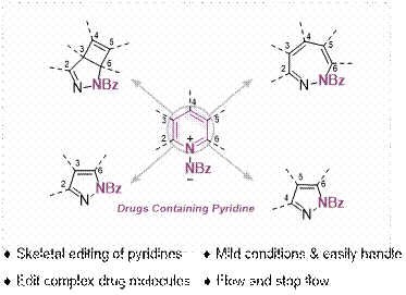 骨架编辑是药物化学领域的新型合成手段,可通过选择性插入、删除或交换原子来修饰分子骨架的特定位点,同时保留核心结构。吡啶是药物中常见的一种杂环结构,广泛存在于生物分子、配体和功能材料中。吡啶编辑的方法大多集中在环外周C-H键的官能团化上,但此类方法无法对底物的核心骨架进行改变。因此,吡啶的直接骨架编辑仍需要更多的研究。目前,吡啶骨架编辑转换可分为两种策略:扩环和缩环。通过N-官能团化吡啶盐实现吡啶的扩环已经实现且有了较多报道;在光或电作用下通过碳删除进行缩环也已有文献记载,其产物为吡咯或吡唑啉。