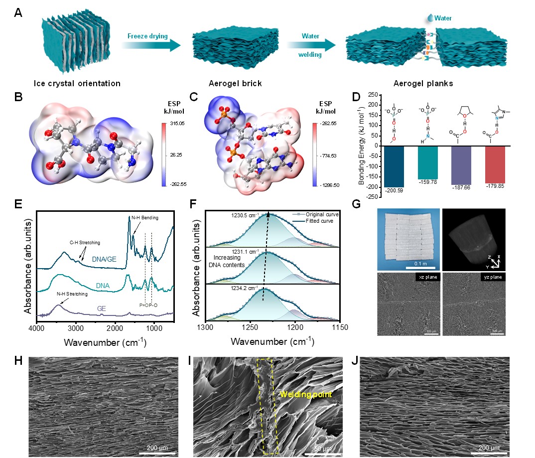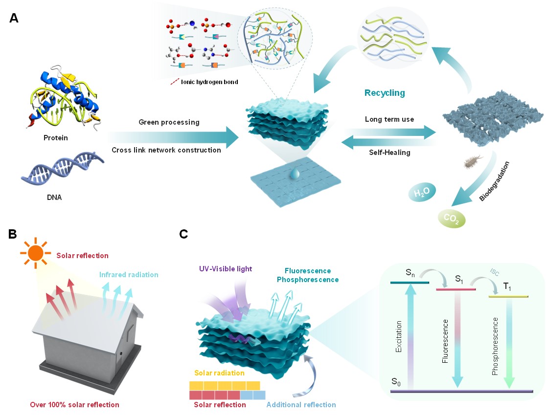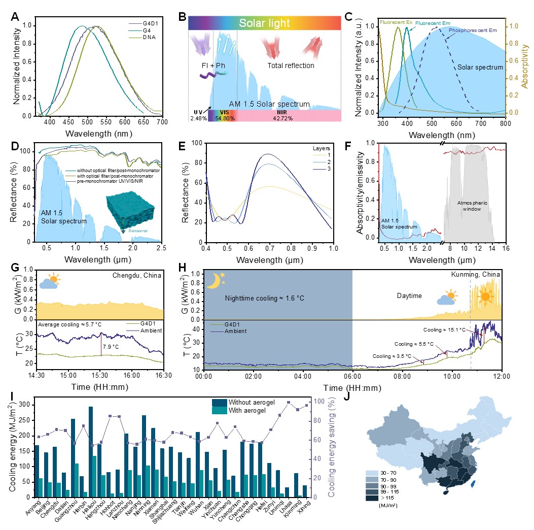 环保型高分子材料国家地方联合工程实验室王玉忠院士团队赵海波教授提出了一种基于生物质本征光致发光辐射制冷新策略,发展了具有高太阳光反射率、可大规模制备、可循环利用的全生物质辐射冷却气凝胶。研究发现,由明胶和DNA制备的生物质气凝胶具有独特的荧光/磷光特性以及高度有序的层状结构。这种本征光致发光效应使得气凝胶将吸收的紫外光转化为可见光,有效提高气凝胶材料在可见光区域的太阳光加权反射率(太阳光模拟下高达104.0%),大幅增益气凝胶材料的日间辐射冷却效率。该气凝胶在高太阳辐照度的户外条件下,环境温度降低达16.0 ℃,表现出优异的制冷性能。另一方面,利用水介导气凝胶界面处强离子氢键的可逆解离-重构特性,通过可扩展、普适的水焊接策略实现了具有各向异性孔结构气凝胶板的大规模制备,长程有序的孔结构可确保气凝胶材料光学性质及综合性能的可靠性。此外,该全生物质气凝胶材料具有阻燃、可快速自修复、可循环利用和可生物降解等性能,在材料来源、制备、使用及废弃的全生命周期具有高环境友好性。这种可扩展的光致发光生物质冷却气凝胶有望显著减少碳排放和能源消耗,为未来可持续辐射冷却材料的设计制备提供新思路。