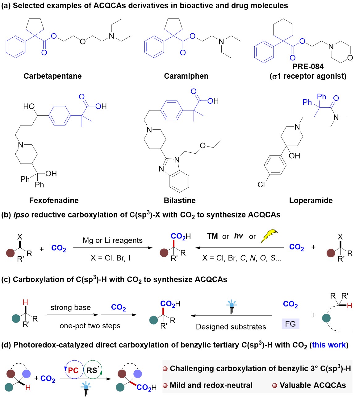 二氧化碳(CO2)具有储量丰富、廉价易得、低毒和可再生等优点,是理想的碳一合成子,利用其合成高附加值化学品具有重要意义。另一方面,全碳季碳羧酸(all-carbon quaternary carboxylic acids, ACQCAs)作为一类重要的有机分子骨架,广泛存在于药物分子和生物活性分子当中,其合成具有重要价值且备受关注。目前,利用CO2作为羧基源合成季碳羧酸,主要集中于当量有机金属试剂对CO2的亲核进攻、有机亲电试剂的还原羧基化以及不饱和烃的官能团化羧基化等。相比而言,通过C–H键直接羧基化合成季碳羧酸则具有更高的步骤经济性和原子经济性,更符合绿色化学的发展理念。然而,由于C–H键(特别是三级C–H键存在较大的位阻)和CO2的惰性,其直接羧基化转化面临反应条件苛刻、底物局限等挑战。因此,亟待开发温和条件下CO2参与三级C–H键直接羧基化转化,合成重要的高值季碳羧酸。
