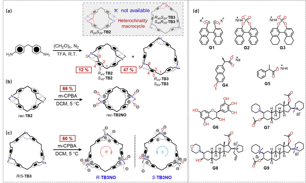近日,杨成/伍晚花团队合成了一类新型的基于Tröger's Base(TB)的大环芳烃(TBn),该大环中TB单元通过亚甲基桥连,形成具有刚性框架的大环。进一步通过将手性纯TBn大环氧化产生相应氮氧化物 (TBnNO),由于分子中N-O键的高极性,使得TBnNO大环表现出良好的水溶性。在水溶液中,TBnNO对多种手性客体表现出卓越的对映选择性识别能力,获得高达41的对映选择性新记录。研究结果表明,即使通过疏水力等非定向相互作用,刚性手性主体也能实现显著的对映体区分。这种含氮大环芳烃的直接合成方法和氮氧化修饰为超分子应用提供了广阔的前景。