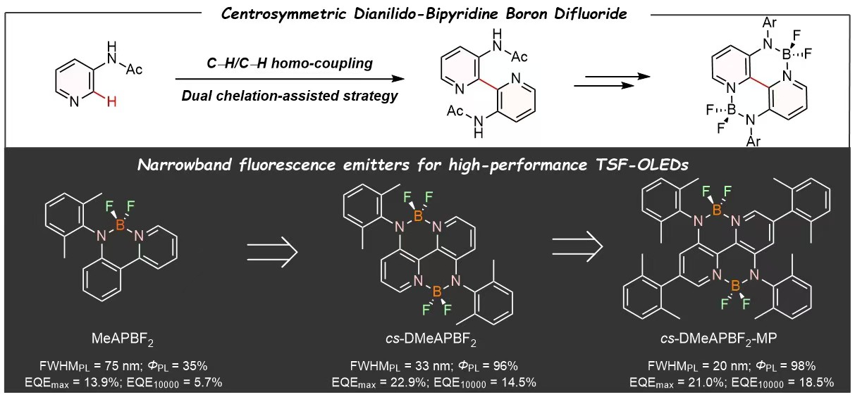 氟硼化合物通常表现出优秀的荧光性质,近年来氟硼二吡咯(BODIPY)的荧光发光材料已经在超高清有机发光二极管(UHD-OLED)显示技术中取得了显著进展,但其他类型的氟硼荧光化合物存在诸如光谱较宽等问题,这限制了其在UHD-OLED中的应用潜力,开发新型窄光谱发光材料是当前领域的重点亦是难点。